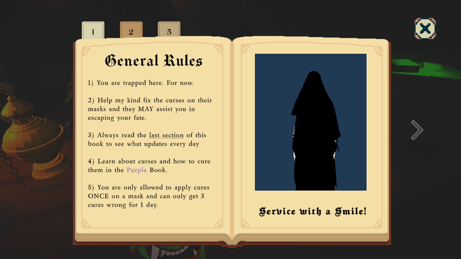 You are trapped in a room, doomed to forever go through masks brought to you by faceless entities every day to cure them.
